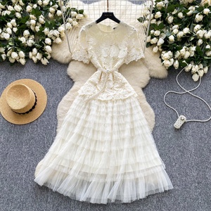 Perlé col rond manches courtes dentelle Patchwork taille cintrage maille robe gonflée pour les femmes